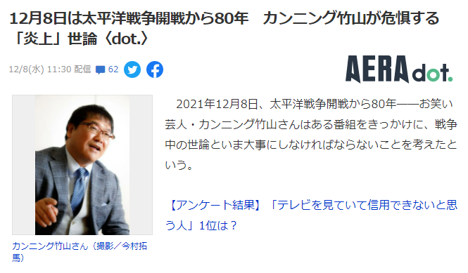 2021年12月8日、太平洋戦争開戦から80年――お笑い芸人・カンニング竹山さんはある番組をきっかけに、戦争中の世論といま大事にしなければならないことを考えたという。
