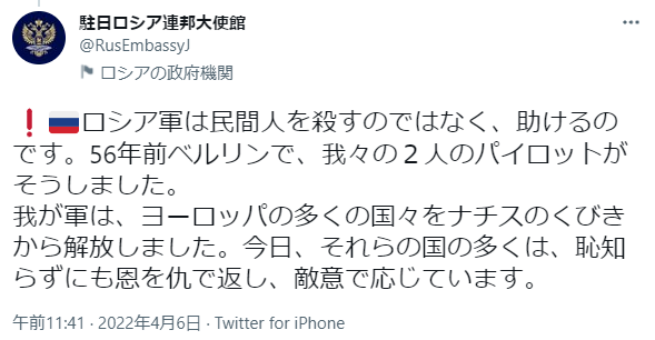 ロシア軍は民間人を殺すのではなく、助けるのです。56年前ベルリンで、我々の2人のパイロットがそうしました。我が軍は、ヨーロッパの多くの国々をナチスのくびきから解放しました。今日、それらの国の多くは、恥知らずにも恩を仇で返し、敵意で応じています。