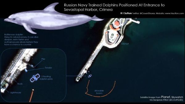 米海軍研究所が28日に発表した内容によると、ウクライナ侵攻の直前に、ロシア軍はクリミアのセヴァストポリ港のゲートにイルカの檻を移動させたという。