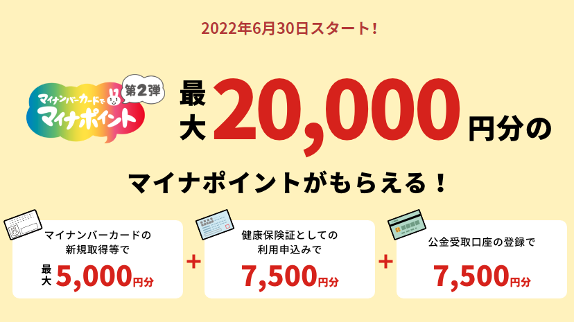 「マイナポイント第2弾」は、マイナンバーカードの取得に伴って最大5000円分、健康保険証としての登録や公金受取口座の登録で、それぞれ7500円分ずつ、合わせて最大2万円分のポイントが付与されます。