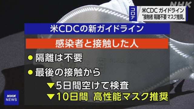 アメリカCDC=疾病対策センターは11日、新型コロナウイルスに関するガイドラインを更新し、ワクチンの接種状況にかかわらず感染者と接触した人の隔離を不要とし、代わりに一定期間、高性能マスクの着用を推奨すると発表しました。アメリカでは先月中旬以降、一日に報告される新型コロナウイルスの感染者は平均でおおむね10万人余り、死者の数は400人ほどで推移しています。