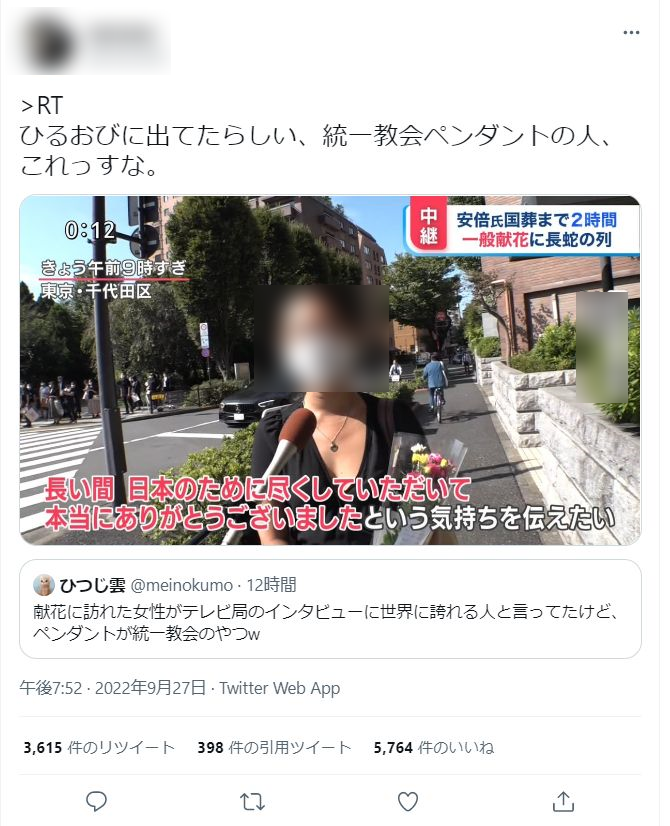 引用元: ・【これがパヨクだ】「献花の列は全部統一教会 証拠見つけた」 ← デマで一般人女性を晒し大変な事に [565421181]