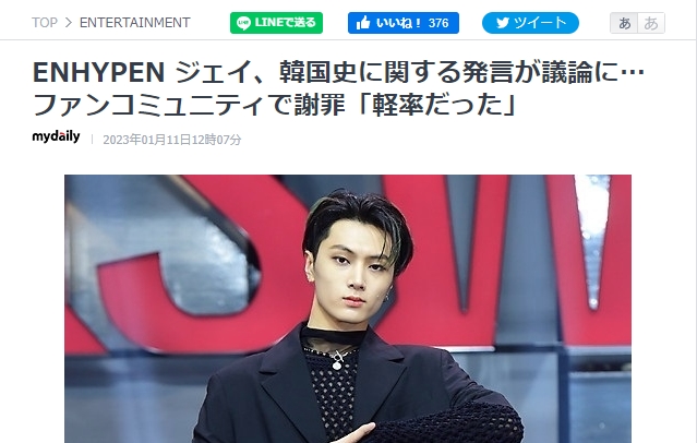 ENHYPENのジェイが、韓国史に関する発言による議論に謝罪した。