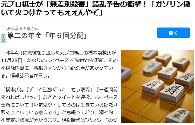 橋本元棋士は、去年11月29日、ツイッターに「僕のすべてを潰した」とか、「僕を地獄の底に落とした」などと、大津市に住む30代の元妻を中傷する内容を投稿したとして、名誉毀損の疑いがもたれています。