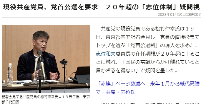共産党の現役党員である松竹伸幸氏は19日、東京都内で記者会見し、党員の直接投票でトップを選ぶ「党首公選制」の導入を求めた。志位和夫委員長の在任期間が20年超に上ることに触れ、「国民の常識からかけ離れていると言わざるを得ない」と疑問を呈した。