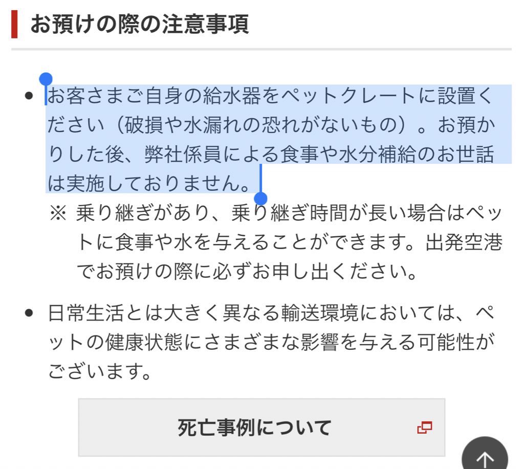 JAL飛行機に預けた犬が亡くなった犬、真夏の飛行機に犬を乗せるにも関わらずクレートに給水機も付けずひんやりマット入れたりとか対策もしてないようで全て飼い主の責任だと思う。サイトにも暑さ、水分についての注意事項が明記されているのに。