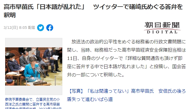 高市「日本語が乱れた」ツイッターで礒崎氏めぐる答弁を釈明 。自民党の誰も擁護しないのも冷たいよな [971283288]https://hayabusa9.5ch.net/test/read.cgi/news/1678580597/