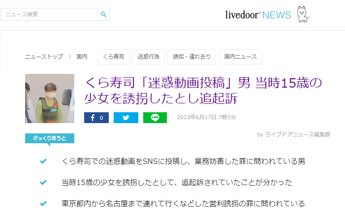 くら寿司“迷惑動画投稿”の男(21)少女誘拐の罪で追起訴「名古屋なら援交して稼げば生活できる」