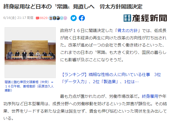 終身雇用など日本の〝常識〟見直しへ 骨太方針閣議決定最も力点が置かれたのが、労働市場改革だ。終身雇用や年功序列など日本型雇用は、成長分野への労働移動を妨げるといった弊害が顕在化。