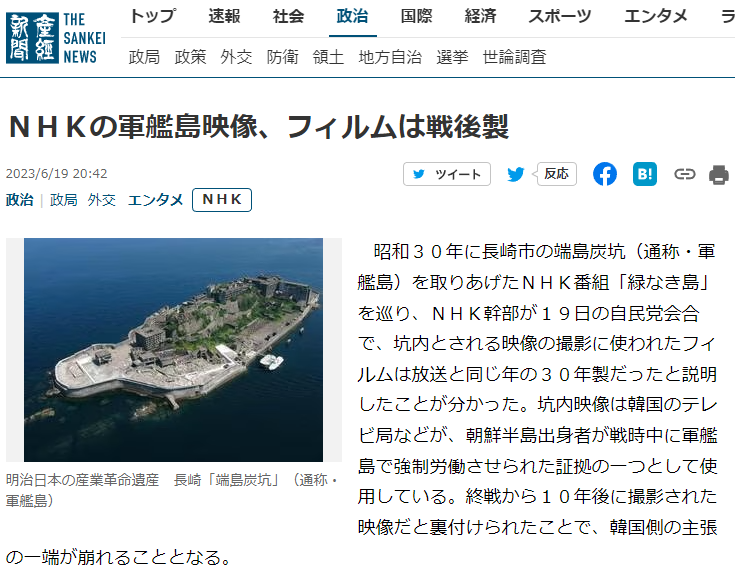 昭和30年に長崎市の端島炭坑(通称・軍艦島)を取りあげたNHK番組「緑なき島」を巡り、NHK幹部が19日の自民党会合で、坑内とされる映像の撮影に使われたフィルムは放送と同じ年の30年製だったと説明したことが分かった。