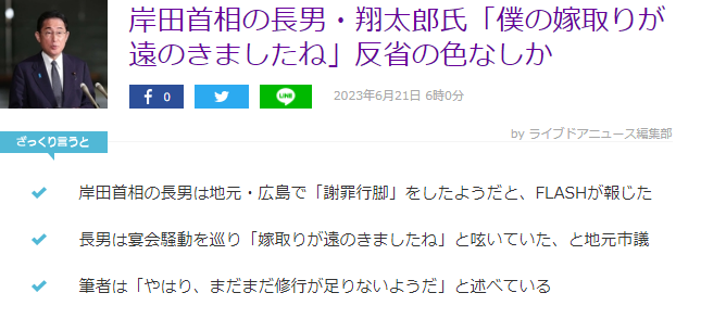 一方、父をさんざん悩ませる “バカ息子” は9日、地元・広島で挨拶まわりをおこなっていた。岸田文雄広島後援会会長・伊藤学人氏は、翔太郎氏に会ったという。