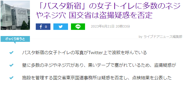 話題となったのは、2023年6月中旬の投稿。バスタ新宿の出発階・4階女子トイレの壁に多数のネジやネジ穴が設置されている写真が掲載された。
