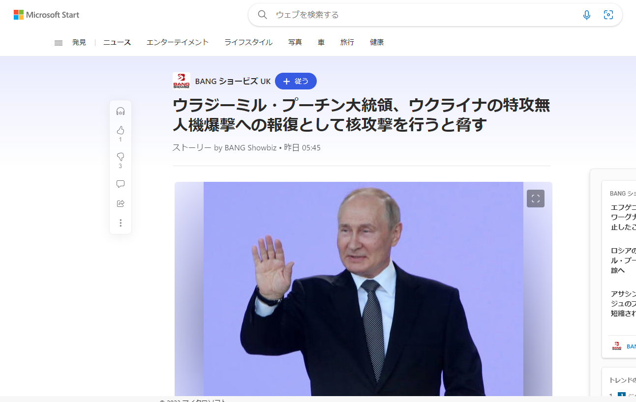 MSNワールドニュース 2023/7/31 ソース英語「Vladimir Putin threatens to unleash nuclear strike in revenge for Ukraine’s kamikaze drone blitz」