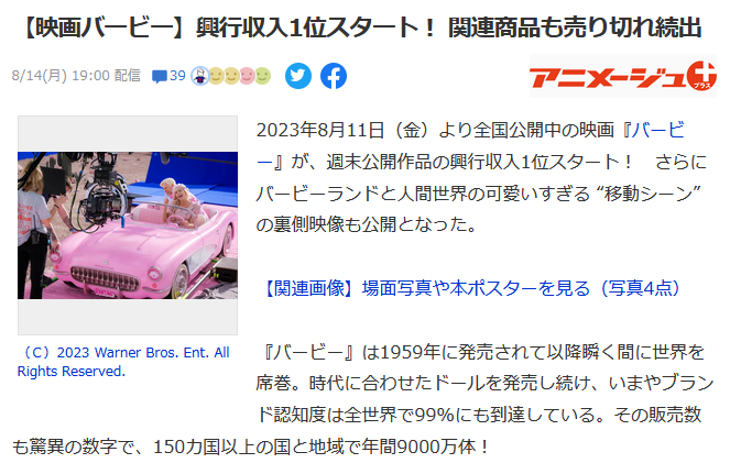 映画『バービー』が、8月11日(金)より日本公開されている。週末の興行収入は3日間で1.9億を突破し堂々の1位を記録した。