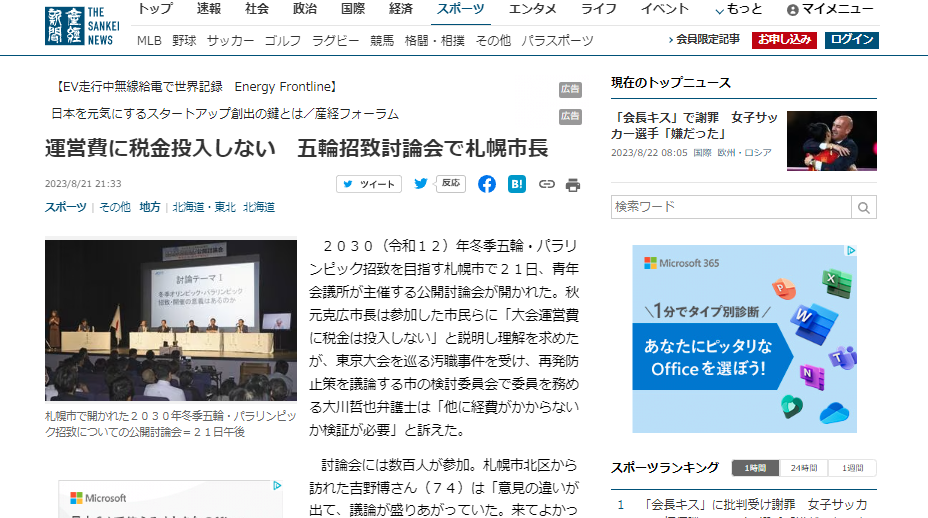 2030(令和12)年冬季五輪・パラリンピック招致を目指す札幌市で21日、青年会議所が主催する公開討論会が開かれた。秋元克広市長は参加した市民らに「大会運営費に税金は投入しない」と説明し理解を求めたが、東京大会を巡る汚職事件を受け、再発防止策を議論する市の検討委員会で委員を務める大川哲也弁護士は「他に経費がかからないか検証が必要」と訴えた。