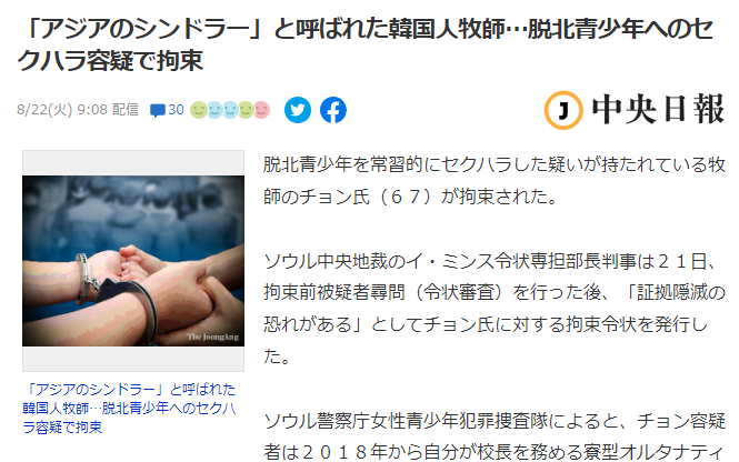 「アジアのシンドラー」と呼ばれた韓国人牧師…脱北青少年へのセクハラ容疑で拘束 [8/22] [昆虫図鑑★]