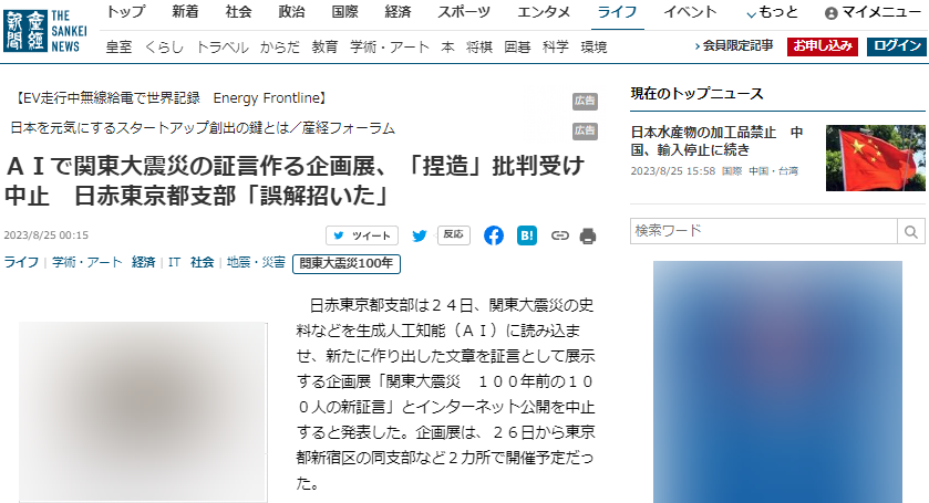 AIで関東大震災の証言作る企画展、「捏造」批判受け中止 日赤東京都支部「誤解招いた」 [香味焙煎★]