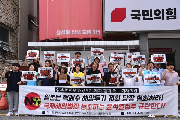 平和大田ナビ行動のパク・キュヨン共同代表は記者会見で、放射能汚染水の海洋放出によって海水や海洋生物が汚染され「最終的には人も死ぬだろう」と強い懸念を示しながら、「日本政府はあらゆる虚偽の策動をやめ、汚染水の海洋投棄を撤回し、自国に保管することを強く要求する」と訴えた。参加者たちは、国民の生命と安全には目もくれず日本政府に同調する尹錫悦政権の姿勢も強く批判した。