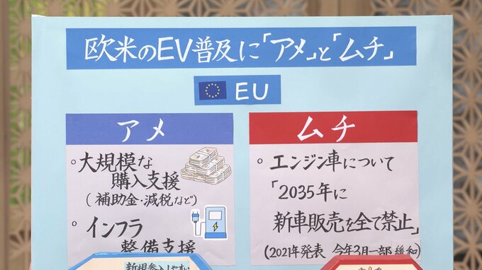 例えばEUでは、大規模な購入支援やインフラ整備支援でEVを優遇。一方で、エンジン車については、「2035年に新車販売をすべて禁止」とするムチを発表。