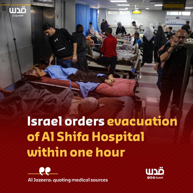 BREAKING: The Israeli occupation army orders doctors, patients, wounded, and displaced people to leave the Al Shifa Medical Complex in #Gaza within an hour, Al Jazeera has said, quoting medical sources from the hospital.