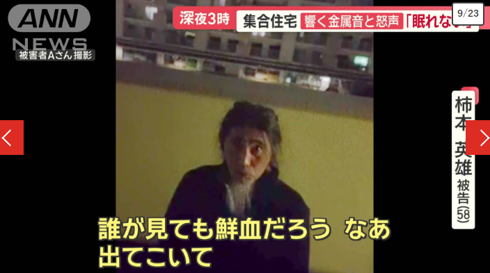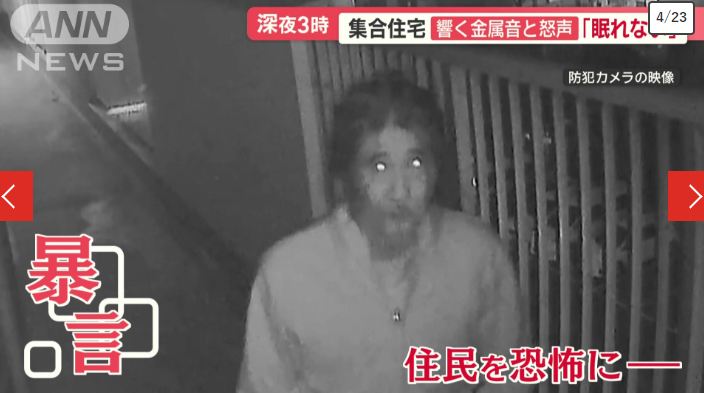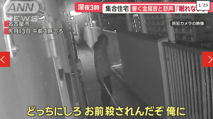 住民が寝静まる午前3時ごろの名古屋市の集合住宅。真夜中に金属音と怒鳴り声が響き渡る。木刀を持ち、金属製の柵を何度も打ち付けて住民を威嚇する。