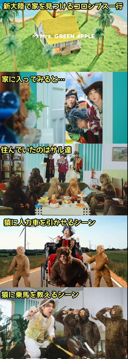 MVは「新大陸で家を発見したコロンブスが、住民の猿と交流する」という内容