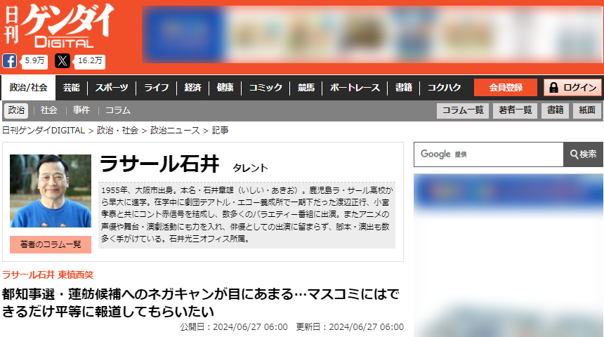 ラサール石井「都知事選・蓮舫候補へのネガキャンが目にあまる…マスコミはできるだけ平等に報道を」 [135853815]