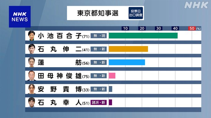 都知事選 小池氏が当選確実 石丸氏 蓮舫氏ら引き離す 出口調査