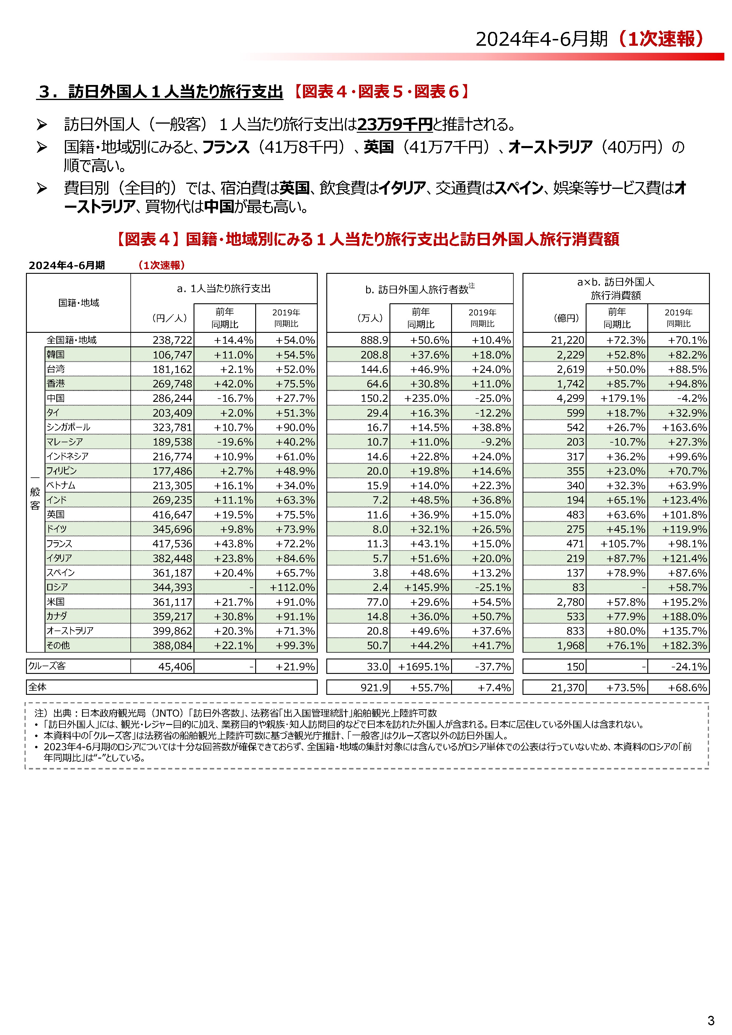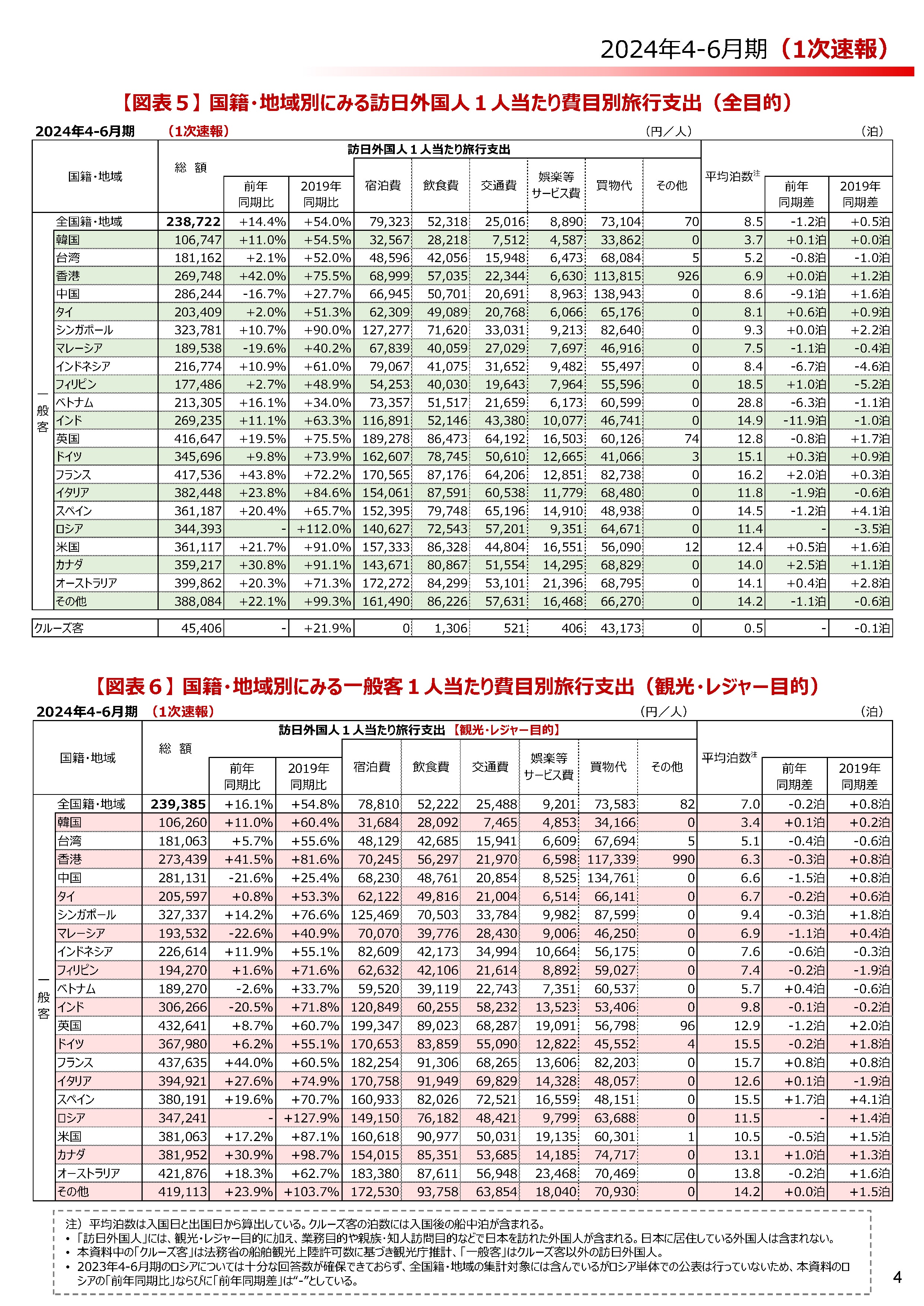 一般客1人あたりの旅行支出は、2019年同期比54%増の23万8722円。国籍・地域別で最も高かったのはフランスで41万7536円。英国の41万6647円、オーストラリアの39万9862円が続いた。2019年比で最も伸び率が高かったのは、ロシアを除き、カナダで91.1%増。そのほか、中国は28万6244円、台湾は18万1162円、韓国は10万6747円。すべての国籍・地域で2019年を上回った。