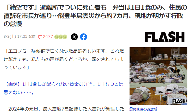 「絶望です」避難所でついに死亡者も 弁当は1日1食のみ、住民の直訴を市長が遮り…能登半島震災から約7カ月、現地が明かす行政の怠慢 [ぐれ★]