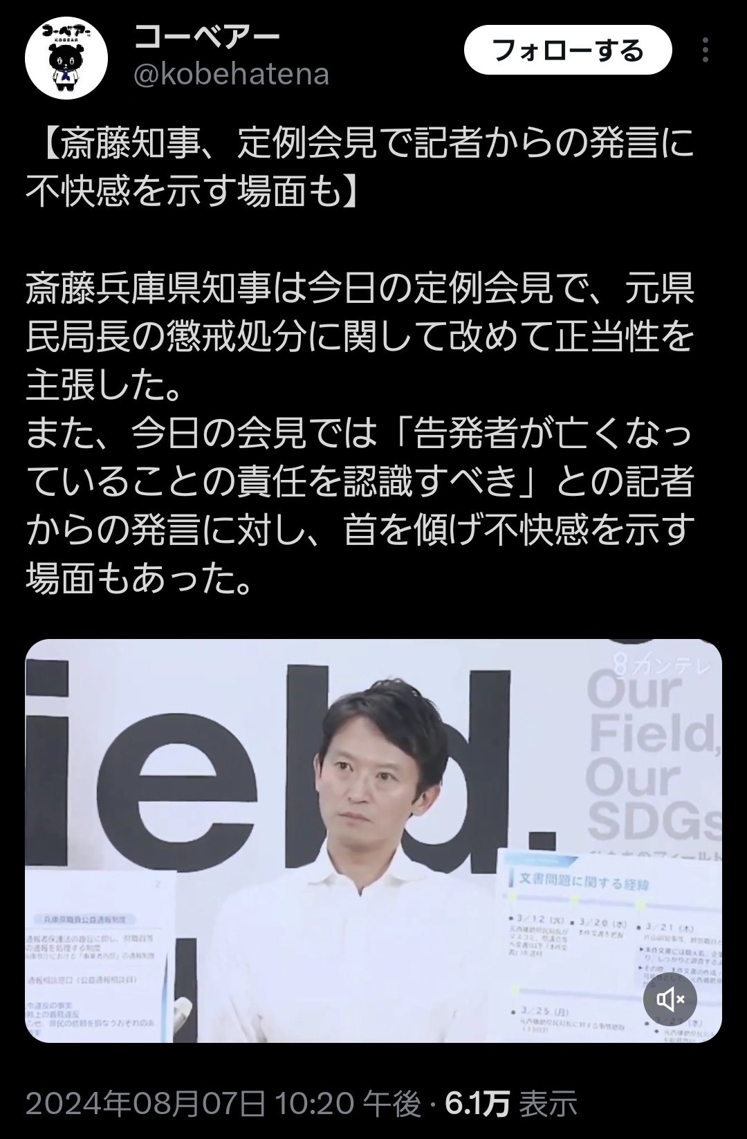 【悲報】記者「人が死んでんねんで!」兵庫県知事斎藤「……🤔」無言で首をかしげる