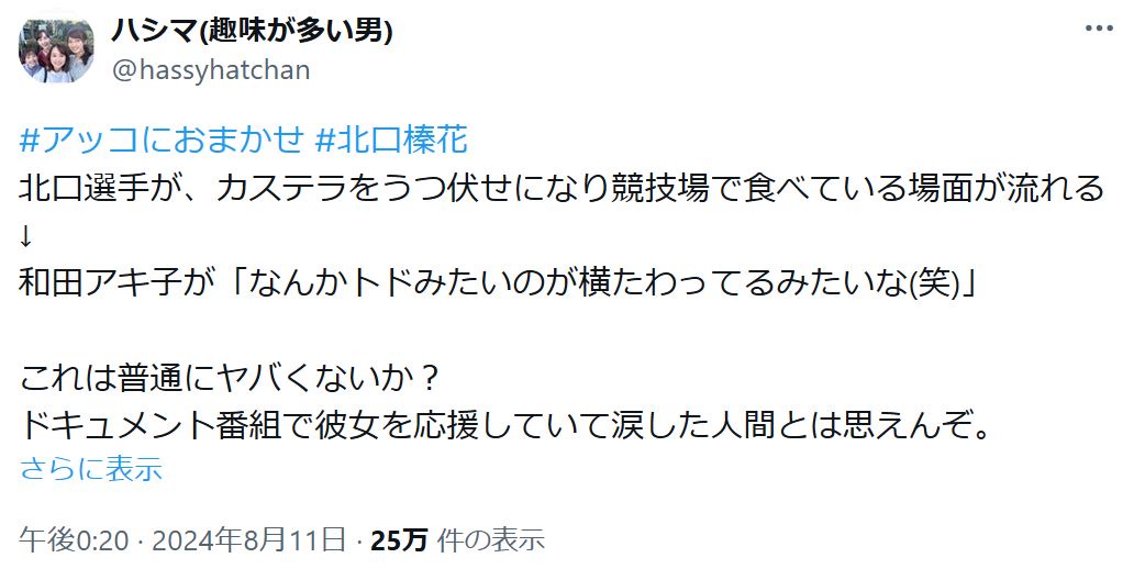 和田アキ子「やり投げで金メダル取った人がトドみたい(笑)」ネット「怒」