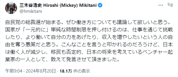 三木谷氏は「自民党の総裁選が始まる。ぜひ働き方についても議論して欲しいと思う」と主張。「国家が“一元的に”単純な時間制限を押し付けるのは、仕事を通じて挑戦したり、より働いて自分の力をあげたり、収入を増やしたいという人の自由を奪う愚策だと思う」と指摘し、「こんなことを言うと叩かれるのだろうけど、日本は働く人が減少し、移民も否定的、日本の将来を考えているベンチャー起業家の一人として、敢えて発言させて頂きました」とした。
