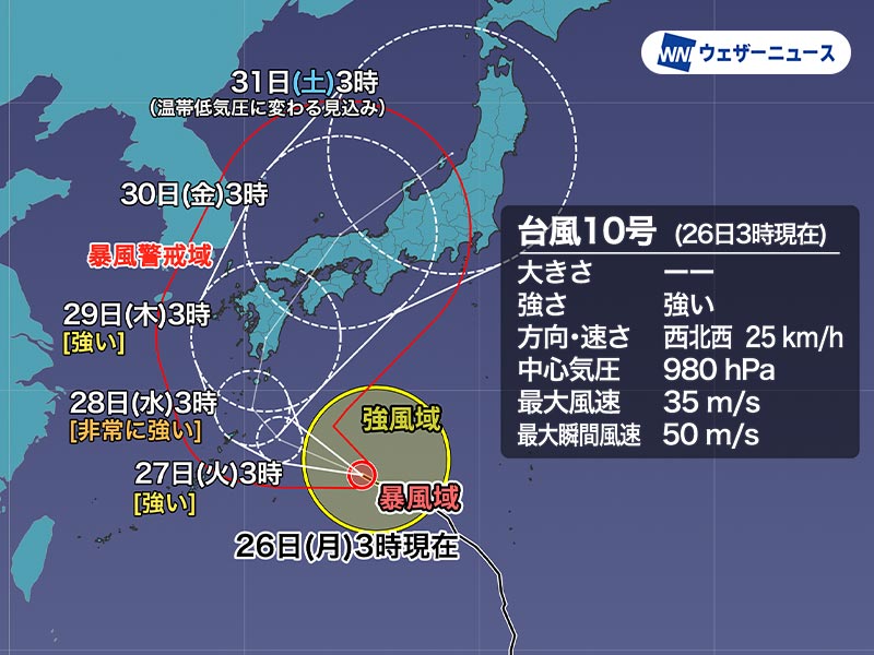 8月26日(月)3時現在、強い台風10号(サンサン)は日本の南を西寄りに進んでいます。これまでの予想よりも進路がさらに西寄りになる予想となり、上陸後は西日本の各地を通過していくおそれがあります。