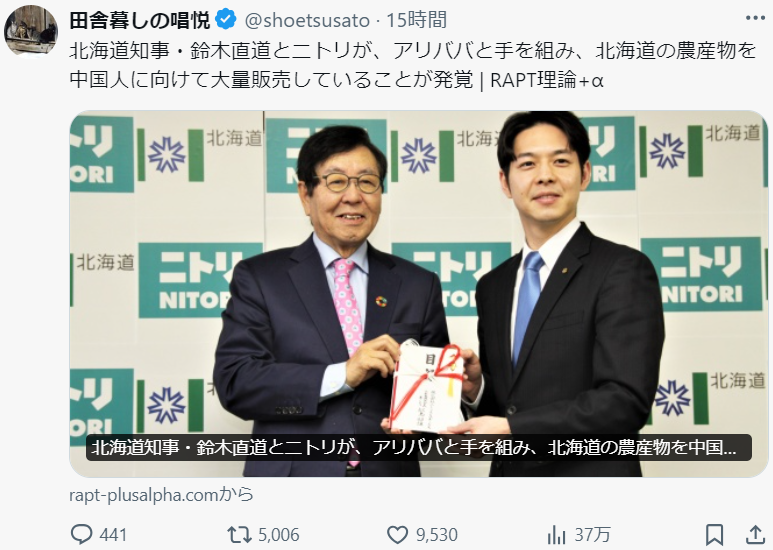 【衝撃】北海道知事、中国アリババとを組み農産物を中国へ大量販売😨