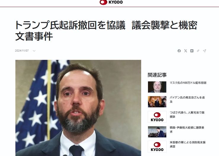 米主要メディアは6日、大統領選で当選を確実にしたトランプ次期大統領が起訴された議会襲撃事件や機密文書持ち出し事件を巡り、担当のスミス特別検察官が、司法省幹部と起訴取り下げを協議していると報じた。現職大統領を起訴できないとする司法省の指針に基づく判断という。