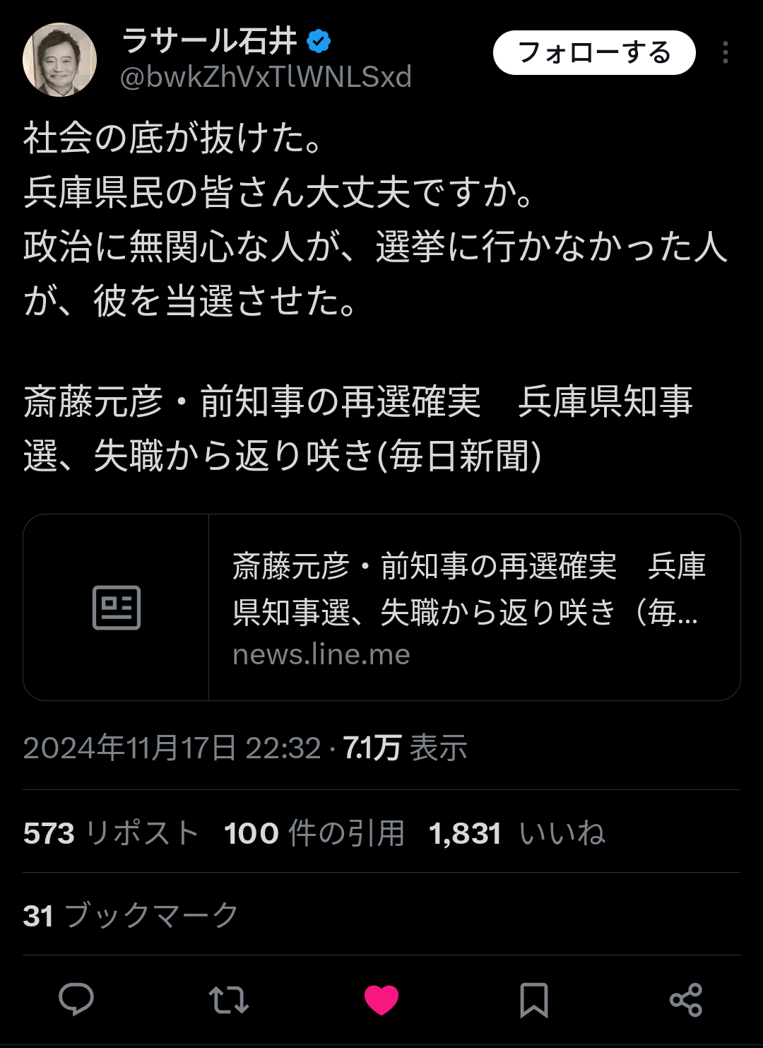 ラ・サール石井さん、兵庫に絶望。「とうとう社会の底が抜けてしまった…選挙への無関心が生んだ結果」 [271912485]
