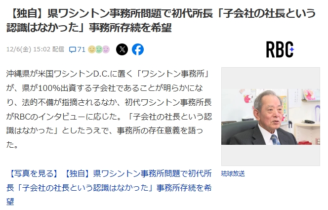 1: 名無し 2024/12/09(月) 08:05:40.99 ID:XkRHmgwV0● BE:662593167-2BP(2000)沖縄県が米国ワシントンD.C.に置く「ワシントン事務所」が、県が100%出資する子会社であることが明らかになり、法的不備が指摘されるなか、初代ワシントン事務所長がRBCのインタビューに応じた。「子会社の社長という認識はなかった」としたうえで、事務所の存在意義を語った。