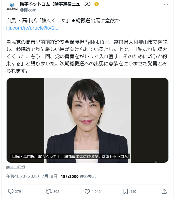 また岸田菅凶悪連合が高市だけは駄目だと言って阻止、その後、岸田再登板の筋書きが見え隠れするはwwwwww