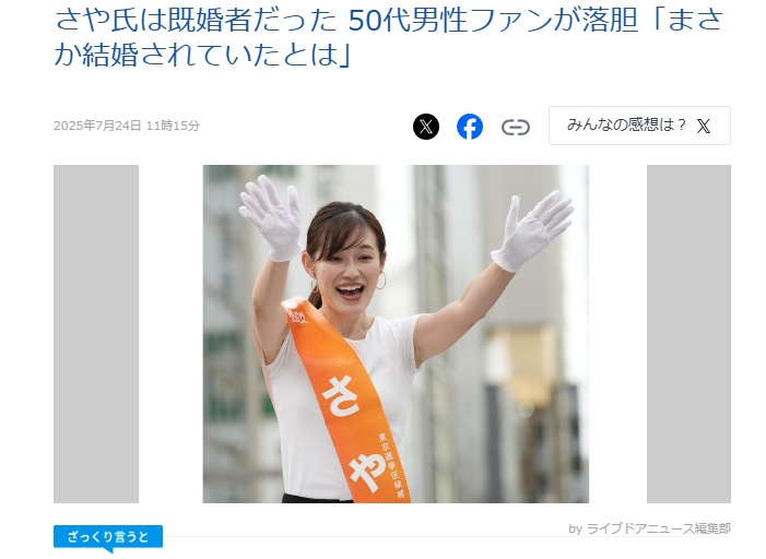 さや氏は既婚者だった 50代男性ファンが落胆「まさか結婚されていたとは」