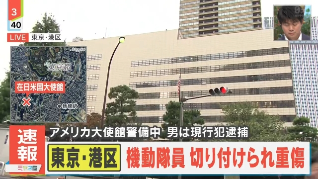 東京・港区のアメリカ大使館近くで「刃物を持った男がいる」と通報があり、現場に駆けつけた機動隊員が負傷。男は現行犯逮捕された。(TBS NEWS DIG)