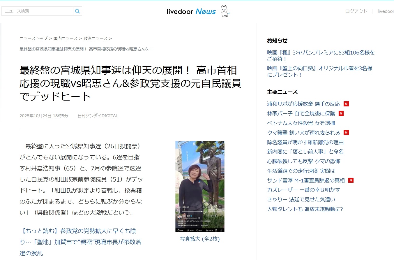 村井氏を高市早苗首相が支援し、和田氏には昭恵夫人が応援動画を寄せた。(ライブドアニュース)