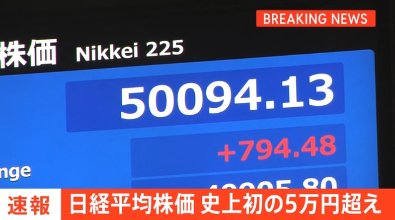 日経平均株価は27日午前の取引で史上初めて5万円を突破した。
