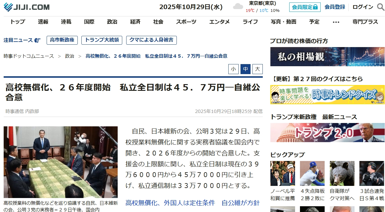 自民・維新・公明の3党が、高校授業料の無償化を2026年度から実施することで合意。