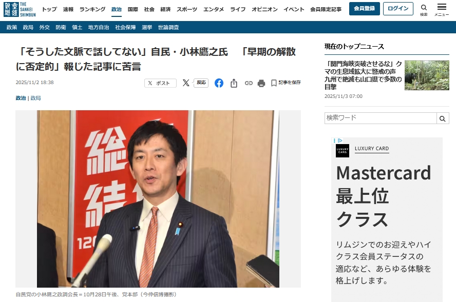 一部報道では「早期の衆院解散に否定的」とされたが、小林氏はXで「そうした文脈で話していない」と否定している。
