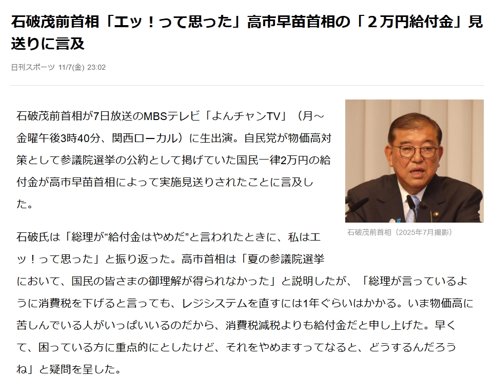 石破茂前首相がテレビ番組で、高市早苗首相が見送った「国民一律2万円給付金」について「エッ!と思った」と発言。物価高対策として給付金の継続を訴えた。