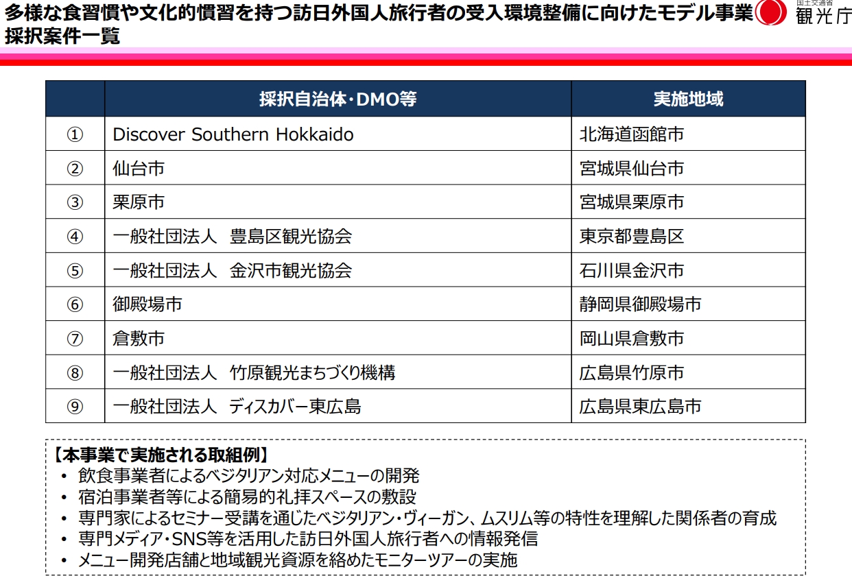 - 採択地域と実施内容について(採択結果): 観光庁:「多様な食習慣や文化的慣習を持つ訪日外国人旅行者の受入環境整備に向けたモデル事業」における採択結果のお知らせ
