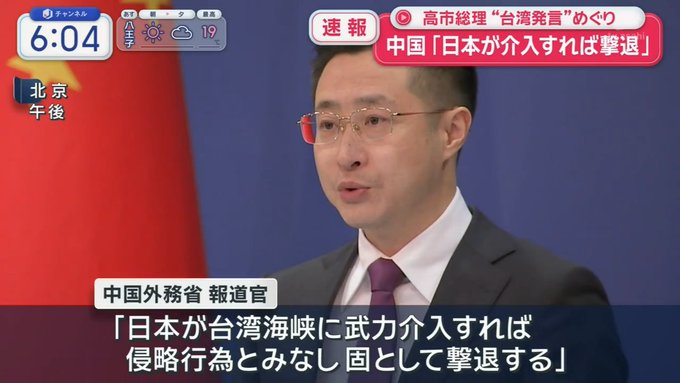 日本では高市早苗首相が国会で「台湾有事は存立危機事態となり得る」と述べ、日米安保が発動する可能性に言及した。これに中国側が反発を強めており、軍関係者の発言や政府声明が連日のように続いている。中国政府は台湾統一を国家目標と位置づける一方、日本の関与を「外部勢力の介入」とみなし、強硬な姿勢を示している。