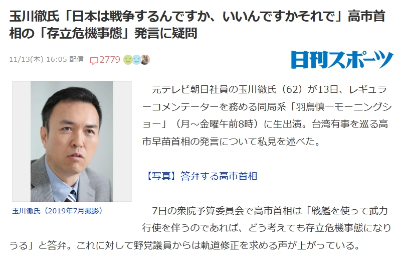 玉川徹氏は高市首相の「台湾有事は存立危機事態になり得る」発言について、