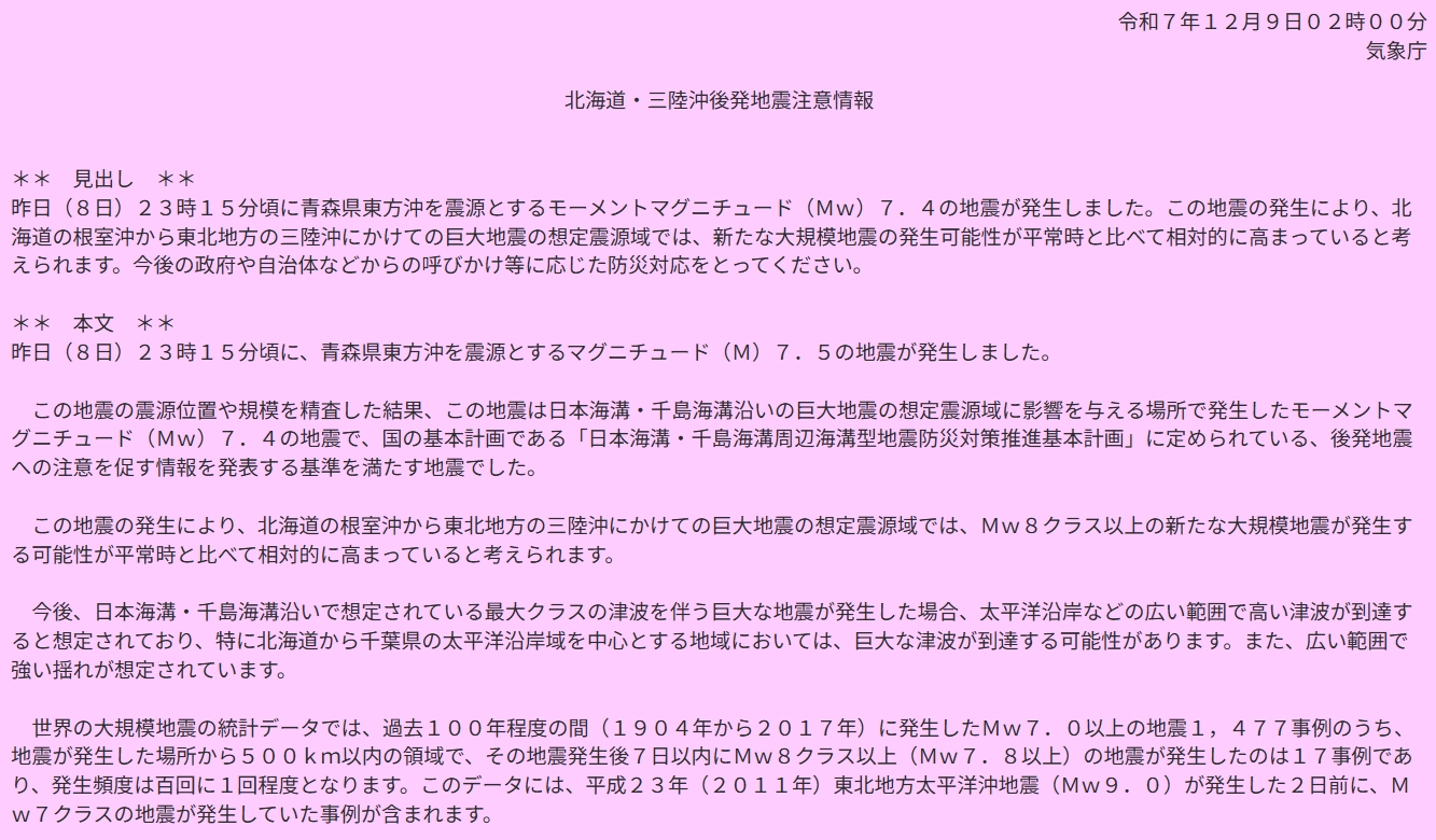 気象庁と内閣府は9日未明、「北海道・三陸沖後発地震注意情報」を初めて発表した。